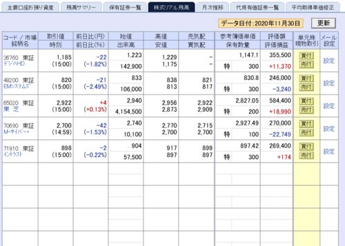 今年はコロナで3月には地獄を見さされましたが、勝負月と位置付けた11月度は投資銘柄を3銘柄から一気に10銘柄に増やし、勝負に出ましたが、今のとこと奏功している感じです。 今日の日経平均も続落しましたが、保有銘柄は4勝6敗ながら、評価損益では勝ち越し…