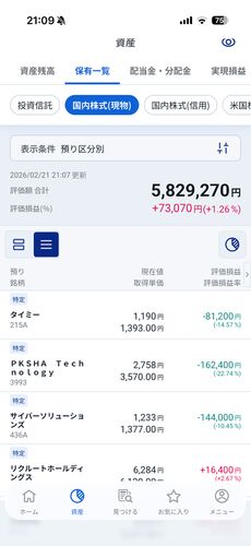 CURRENT ASSETS 16,518,844 JPY +73,070 TARGET: 20,000,000GAP: 3,481,1562026.02.22 SUN ■ SBI証券Plus:評価損益+73,070円、薄氷の防衛線 2026年2月22日、日曜日。3連休の静寂の中で、私は1,651万円という現在地を冷徹に見つめています。金曜日の日経平…